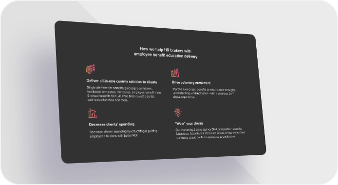How we help HR brokers with employee benefit education delivery Deliver all-in-one comms solution to clients Drive voluntary enrollment Improve awareness, benefits communication strategies, understanding, and motivation - with a seamless 24/7 digital experience. Single platform for benefits guides/presentations, handbook templates, microsites, employee benefit hubs & virtual benefits fairs, AI chat, total rewards portal, wellness education and more. “Wow” your clients Decrease clients’ spending Decrease clients’ spending by educating & guiding employees to plans with better ROI. Our marketing & sales agency DNA (and platform used by Salesforce, Accenture & Omnicom Group) brings world-class marketing-grade content experience to employees.