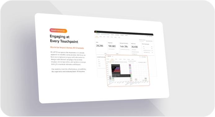 Benefit Campaigns Engaging at Every Touchpoint Maximize Impact Across All Channels RELAYTO recognizes the importance of a holistic approach to benefits communication. We focus on how your employees engage with information to design multi-channel campaigns that actively engage, encourage action, and optimize message timing for maximum relevance and impact. Our analytics track the effectiveness, streamlining the experience and reducing basic HR inquiries.