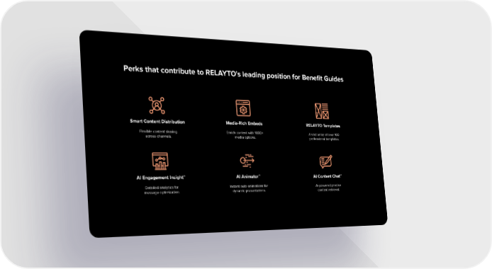 Perks that contribute to RELAYTO's leading position for Benefit Guides Smart Content Distribution Media-Rich Embeds RELAYTO Templates Flexible content sharing Enrich content with 1000+ A vast array of over 100 across channels. media options. professional templates. AI Engagement Insight™ AI Animator™ AI Content Chat™ Detailed analytics for Instant auto-animations for AI-powered precise message optimization. dynamic presentations. content retrieval.
