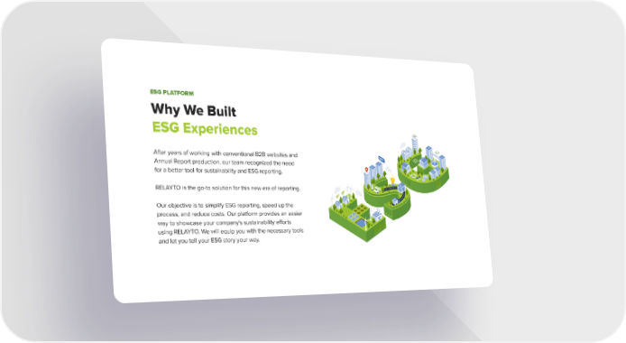 Why We Built ESG Experiences After years of working with conventional B2B websites and Annual Report production, our team recognized the need for a better tool for sustainability and ESG reporting. RELAYTO is the go-to solution for this new era of reporting. Our objective is to simplify ESG reporting, speed up the process, and reduce costs. Our platform provides an easier way to showcase your company's sustainability efforts using RELAYTO. We will equip you with the necessary tools and let you tell your ESG story your way. ESG PLATFORM