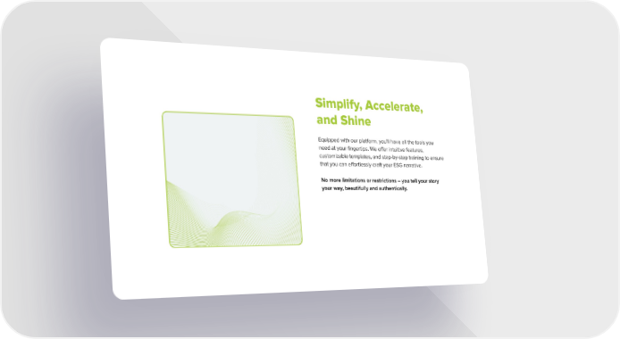 Simplify, Accelerate, and Shine Equipped with our platform, you'll have all the tools you need at your fingertips. We offer intuitive features, customizable templates, and step-by-step training to ensure that you can effortlessly craft your ESG narrative. No more limitations or restrictions – you tell your story your way, beautifully and authentically.