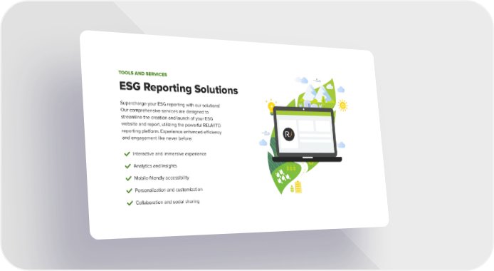 ESG Reporting Solutions Supercharge your ESG reporting with our solutions! Our comprehensive services are designed to streamline the creation and launch of your ESG website and report, utilizing the powerful RELAYTO reporting platform. Experience enhanced efficiency and engagement like never before: TOOLS AND SERVICES Interactive and immersive experience Analytics and insights Mobile-friendly accessibility Personalization and customization Collaboration and social sharing