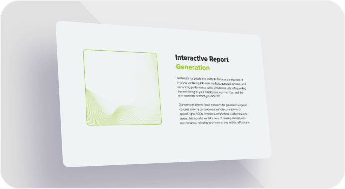 Interactive Report Generation Sustainability entails the ability to thrive and safeguard. It involves venturing into new markets, generating value, and enhancing performance while simultaneously safeguarding the well-being of your employees, communities, and the environments in which you operate. Our services offer tailored solutions for gated and ungated content, making content more self-discoverable and appealing to NGOs, investors, employees, customers, and peers. Additionally, we take care of hosting, design, and maintenance, relieving your team of any additional burdens.