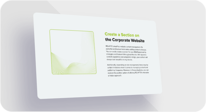 Create a Section on the Corporate Website RELAYTO simplifies website content management. Its powerful architecture tools make adding content a breeze. You can easily create a section for your ESG/Sustainability strategies and feature it throughout the site. With dynamic content capabilities and adaptable design, your content will always look beautiful on any device. Additionally, depending on site management, there may be certain limitations when it comes to managing content and publishing frequency. However, in these situations, you can explore the positive option of utilizing RELAYTO's microsite or index approach.