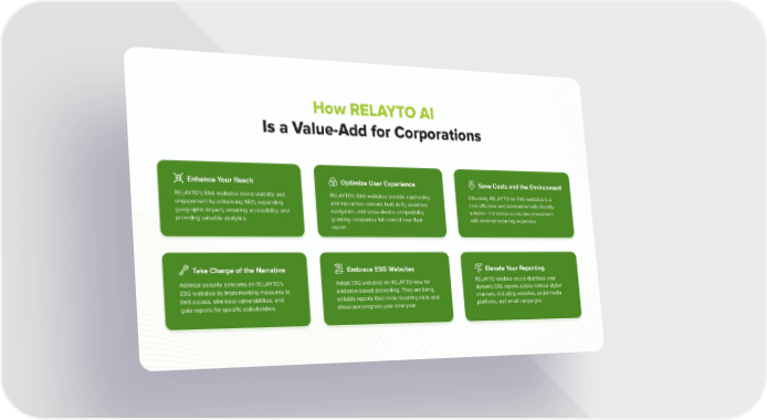 How RELAYTO AI Is a Value-Add for Corporations Enhance Your Reach RELAYTO's ESG websites boost visibility and engagement by enhancing SEO, expanding geographic impact, ensuring accessibility, and providing valuable analytics. Take Charge of the Narrative Address security concerns on RELAYTO's ESG websites by implementing measures to limit access, eliminate vulnerabilities, and gate reports for specific stakeholders. Optimize User Experience RELAYTO's ESG websites provide captivating and interactive content, built-in AI, seamless navigation, and cross-device compatibility, granting companies full control over their report. Embrace ESG Websites Adopt ESG websites on RELAYTO now for evidence-based storytelling. They are living, editable reports that invite recurring visits and showcase progress year-over-year. Save Costs and the Environment Choosing RELAYTO for ESG websites is a cost-effective and environmentally friendly solution. It involves a one-time investment with minimal recurring expenses. Elevate Your Reporting RELAYTO enables you to distribute your dynamic ESG reports across various digital channels, including websites, social media platforms, and email campaigns.
