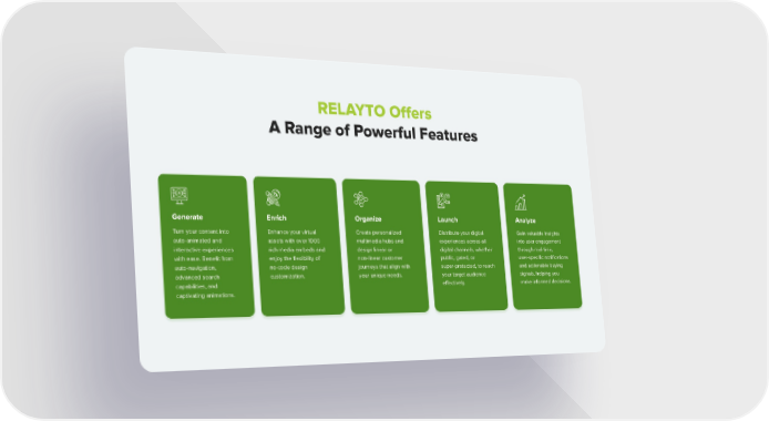 RELAYTO Offers A Range of Powerful Features Generate Turn your content into auto-animated and interactive experiences with ease. Benefit from auto-navigation, advanced search capabilities, and captivating animations. Enrich Enhance your virtual assets with over 1000 rich media embeds and enjoy the flexibility of no-code design customization. Organize Create personalized multimedia hubs and design linear or non-linear customer journeys that align with your unique needs. Launch Distribute your digital experiences across all digital channels, whether public, gated, or super-protected, to reach your target audience effectively. Analyze Gain valuable insights into user engagement through real-time, user-specific notifications and actionable buying signals, helping you make informed decisions.