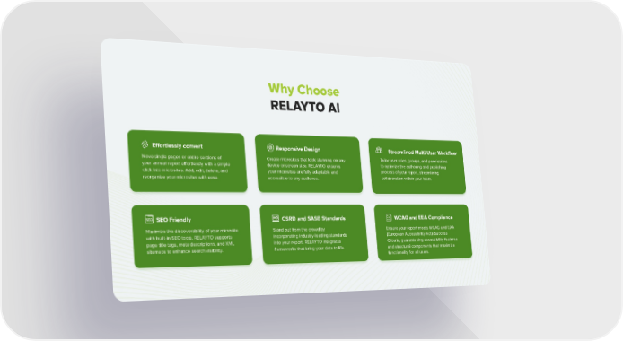 Why Choose RELAYTO AI Effortlessly convert Move single pages or entire sections of your annual report effortlessly with a simple click into microsites. Add, edit, delete, and reorganize your microsites with ease. SEO Friendly Maximize the discoverability of your microsite with built-in SEO tools. RELAYTO supports page title tags, meta descriptions, and XML sitemaps to enhance search visibility. CSRD and SASB Standards Stand out from the crowd by incorporating industry-leading standards into your report. RELAYTO integrates frameworks that bring your data to life. Responsive Design Create microsites that look stunning on any device or screen size. RELAYTO ensures your microsites are fully adaptable and accessible to any audience. WCAG and EEA Compliance Ensure your report meets WCAG and EAA (European Accessibility Act)i Success Criteria, guaranteeing accessibility features and structural components that maximize functionality for all users. Streamlined Multi-User Workflow Tailor user roles, groups, and permissions to optimize the authoring and publishing process of your report, streamlining collaboration within your team.