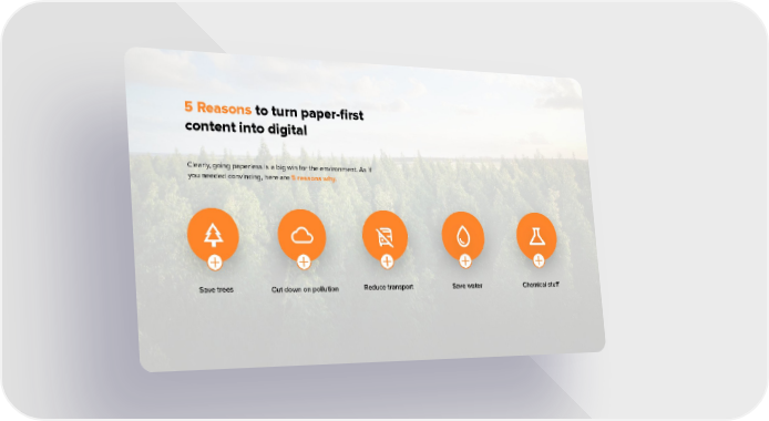 5 Reasons to turn paper-first content into digital Clearly, going paperless is a big win for the environment. As if you needed convincing, here are 5 reasons why. Save trees Reduce transport Save water Chemical stuff Cut down on pollution