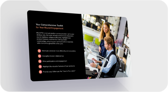 Your Comprehensive Toolkit for Year-Round Engagement RELAYTO is not just another service provider; we’re your strategic ally. Our suite of tools and services empowers you to distribute collateral efficiently, highlight your product features, and maintain strong broker relationships, ensuring your communications resonate with clients throughout the entire year. Distribute collateral more efficiently and accurately Strengthen broker relationships Drive participation and engagement Highlight the valuable features of your products Provide easy follow ups like “how to file a claim”