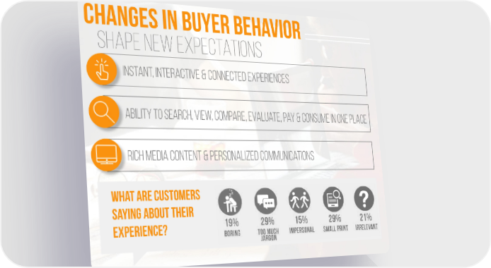 Changes in buyer behavior Shape new expectations instant, interactive & connected experiences ability to search, view, compare, evaluate, pay & consume in one place rich media content & personalized communications What are customers saying about their experience?