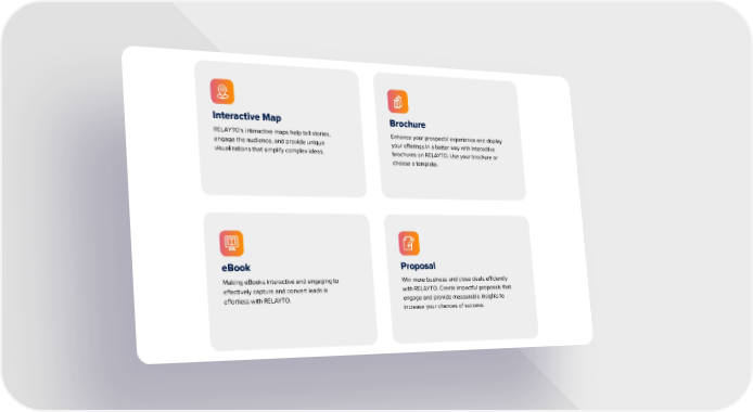 Interactive Map Brochure RELAYTO's interactive maps help tell stories, Enhance your prospects' experience and display engage the audience, and provide unique your offerings in a better way with interactive visualizations that simplify complex ideas. brochures on RELAYTO. Use your brochure or choose a template. eBook Proposal Making eBooks interactive and engaging to Win more business and close deals efficiently effectively capture and convert leads is with RELAYTO. Create impactful proposals that effortless with RELAYTO. engage and provide measurable insights to increase your chances of success.