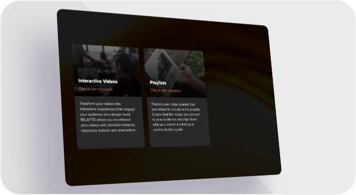 Interactive Videos Playlists Click to see examples Click to see examples Transform your videos into Prepare your video content that interactive experiences that engage you intend to include in the playlist. your audience on a deeper level. Ensure that the videos are relevant RELAYTO allows you to enhance to your audience and align them your videos with clickable hotspots, with your overall marketing or interactive buttons and annotations. communication goals.