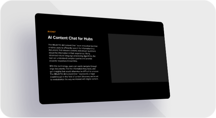 AI CHAT AI Content Chat for Hubs The RELAYTO AI Content Chat ™ is an innovative tool that enables users to efficiently search for information in a document, find relevant content, and answer questions about the information in their experience. Using advanced natural language processing algorithms, the tool can understand complex queries and provide accurate responses in real-time. With this technology, users can easily navigate through large documents, find the information they need, and gain insights that would otherwise be difficult to uncover. The RELAYTO AI Content Chat ™ represents a major breakthrough in the field of content discovery and is set to revolutionize the way we interact with digital content.