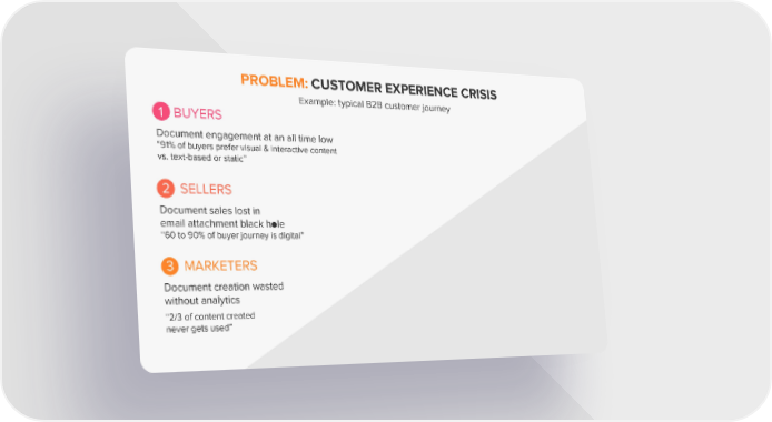 PROBLEM: CUSTOMER EXPERIENCE CRISIS Example: typical B2B customer journey 1 BUYERS Document engagement at an all time low “91% of buyers prefer visual & interactive content vs. text-based or static” 2 SELLERS Document sales lost in email attachment black hole “60 to 90% of buyer journey is digital” 3 MARKETERS Document creation wasted without analytics “2/3 of content created never gets used”