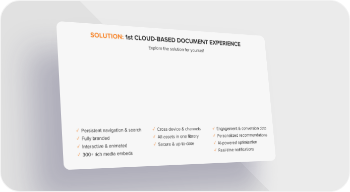 SOLUTION: 1st CLOUD-BASED DOCUMENT EXPERIENCE Explore the solution for yourself ✓ Persistent navigation & search ✓ Cross device & channels ✓ Engagement & conversion data ✓ Fully branded ✓ All assets in one library ✓ Personalized recommendations ✓ Interactive & animated ✓ Secure & up-to-date ✓ AI-powered optimization ✓ 300+ rich media embeds ✓ Real-time notifications