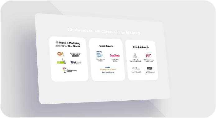 70+ Awards for our Clients and for RELAYTO RELAYTO AI powered platform has brought an entirely new approach to pursuits, by converting all sales content and any file type into a single immersive digital experience, 65 Digital & Marketing which enables deal teams to connect and collaborate with customers, bring big ideas to Cloud Awards Data & AI Awards Awards for Our Clients life and differentiate Accenture from competition. Cloud Vendor Top 4 SaaS Top 3 AI MIT AI Conference Finalist Startup Marketing & Adtech AI Idol: Top 5 Top 50 Data & AI Top 50 Disruptors Best SaaS Provider