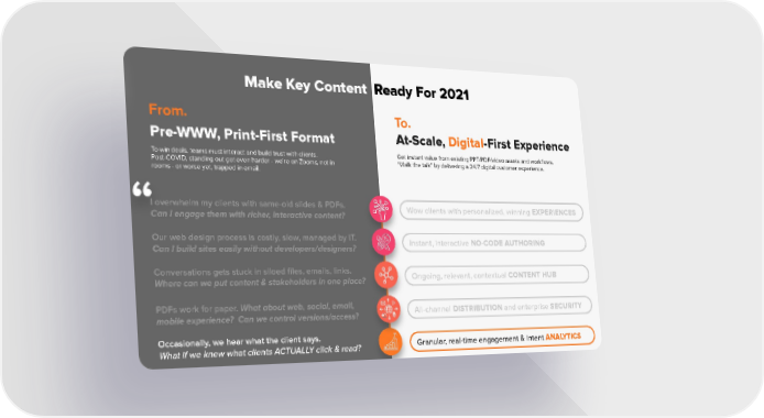 Make Key Content Ready For 2021 SUMMARYEXPERIENCEDISTRIBUTIONANALYTICS From. To. At-Scale, Digital-First Experience Pre-WWW, Print-First Format To win deals, teams must interact and build trust with clients. Get instant value from existing PPT/PDF/video assets and workflows. Post-COVID, standing out got even harder - we’re on Zooms, not in “Walk the talk” by delivering a 24/7 digital customer experience. rooms - or worse yet, trapped in email. I overwhelm my clients with same-old slides & PDFs. Wow clients with personalized, winning EXPERIENCES Can I engage them with richer, interactive content? Lack of client engagement Our web design process is costly, slow, managed by IT. Instant, interactive NO-CODE AUTHORING Can I build sites easily without developers/designers? Suboptimal distribution Conversations gets stuck in siloed files, emails, links. Ongoing, relevant, contextual CONTENT HUB No feedback or MI Where can we put content & stakeholders in one place? PDFs work for paper. What about web, social, email, All-channel DISTRIBUTION and enterprise SECURITY mobile experience? Can we control versions/access? Occasionally, we hear what the client says. Granular, real-time engagement & intent ANALYTICS What if we knew what clients ACTUALLY click & read? Summary Experience Distribution Analytics