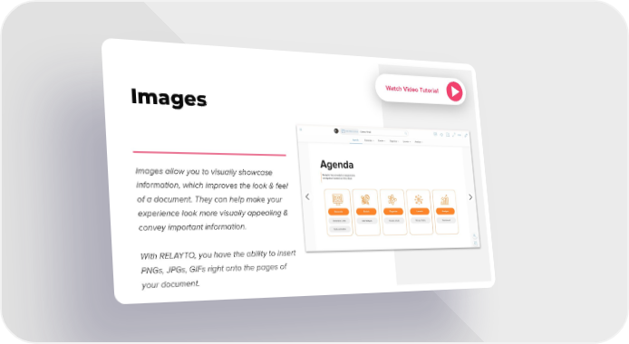 Watch Video Tutorial Images Images allow you to visually showcase information, which improves the look & feel of a document. They can help make your experience look more visually appealing & convey important information. With RELAYTO, you have the ability to insert PNGs, JPGs, GIFs right onto the pages of your document.
