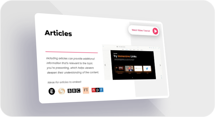 Watch Video Tutorial Articles Including articles can provide additional information that’s relevant to the topic you’re presenting, which helps viewers deepen their understanding of the content. Ideas for articles to embed: