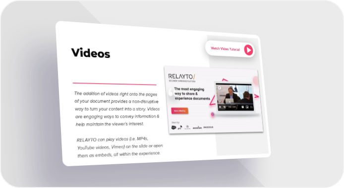 Watch Video Tutorial Videos The addition of videos right onto the pages of your document provides a non-disruptive way to turn your content into a story. Videos are engaging ways to convey information & help maintain the viewer’s interest. RELAYTO can play videos (i.e. MP4s, YouTube videos, Vimeo) on the slide or open them as embeds, all within the experience.