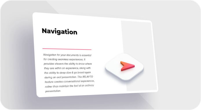 Navigation Navigation for your documents is essential for creating seamless experiences. It provides viewers the ability to know where they are within an experience, along with the ability to deep dive & go broad again during an oral presentation. This RELAYTO feature creates conversational experiences, rather than maintain the feel of an ordinary presentation.