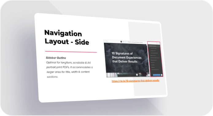 Navigation Layout - Side Sidebar Outline Optimal for longform, scrollable & A4 portrait print PDFs. It accommodates a larger area for title, width & content sections. https://rla.to/10-signatures-that-deliver-results