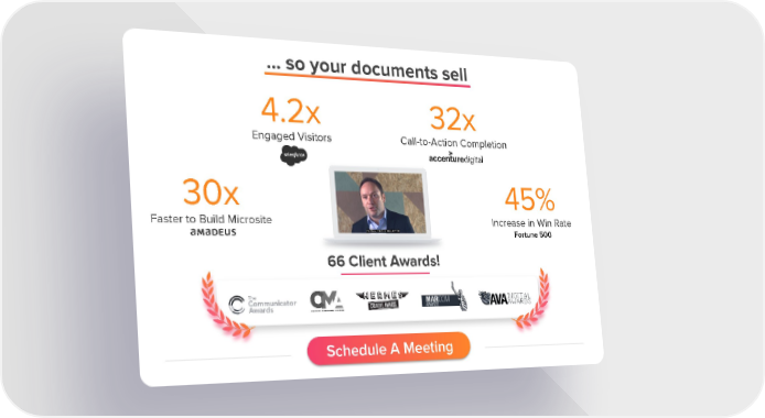… so your documents sell 4.2x 32x Engaged Visitors Call-to-Action Completion Zero Insights Zero Optimization 30x 45% Faster to Build Microsite Increase in Win Rate Fortune 500 66 Client Awards! Schedule A Meeting