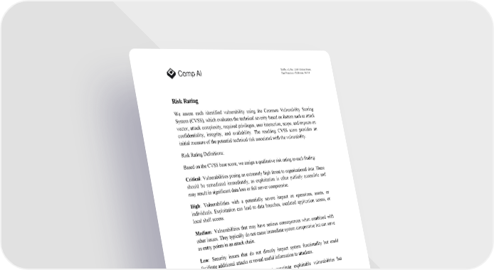 Bubba AI, Inc. 2261 Market Street, San Francisco, California, 94114 Risk Rating We assess each identified vulnerability using the Common Vulnerability Scoring System (CVSS), which evaluates the technical severity based on factors such as attack vector, attack complexity, required privileges, user interaction, scope, and impacts on confidentiality, integrity, and availability. The resulting CVSS score provides an initial measure of the potential technical risk associated with the vulnerability. Risk Rating Definitions: Based on the CVSS base score, we assign a qualitative risk rating to each finding: Critical : Vulnerabilities posing an extremely high threat to organizational data. These should be remediated immediately, as exploitation is often publicly accessible and may result in significant data loss or full server compromise. High : Vulnerabilities with a potentially severe impact on operations, assets, or individuals. Exploitation can lead to data breaches, escalated application access, or local shell access. Medium : Vulnerabilities that may have serious consequences when combined with other issues. They typically do not cause immediate system compromise but can serve as entry points in an attack chain. Low : Security issues that do not directly impact system functionality but could facilitate additional attacks or reveal useful information to attackers. Informational : Findings that do not constitute exploitable vulnerabilities but highlight missing best practices or default information exposure.