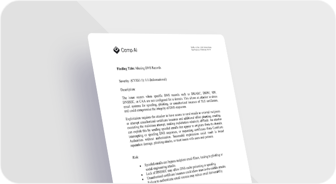 Bubba AI, Inc. 2261 Market Street, San Francisco, California, 94114 Finding Title: Missing DNS Records Severity: (CVSS3.1): 0.0 (Informational) Description: The issue occurs when specific DNS records such as DMARC, DKIM, SPF, DNSSEC, or CAA are not configured for a domain. This allows an attacker to abuse email systems for spoofing, phishing, or unauthorized issuance of TLS certificates, and could compromise the integrity of DNS responses. Exploitation requires the attacker to have access to send emails to external recipients or attempt unauthorized certificate issuance and additional effort planning, creating, executing the malicious attempt, making exploitation relatively difficult. An attacker can exploit this by sending spoofed emails that appear to originate from the domain, intercepting or spoofing DNS responses, or requesting certificates from Certificate Authorities without authorization. Successful exploitation could result in brand reputation damage, phishing attacks, or trust issues with users and partners. Risk: Spoofed emails can bypass recipient email filters, leading to phishing or social engineering attacks. Lack of DNSSEC may allow DNS cache poisoning or spoofing. Unauthorized certificate issuance could allow man-in-the-middle attacks. Failure to authenticate email sources may reduce email deliverability.