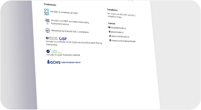 About us Company Intruder Systems Ltd is an independent security advisory company, specialising in providing continuous security monitoring for internet-facing web applications and infrastructure. Security Team Our consultants have delivered work for government agencies, international financial institutions, and global retail giants. Credentials Intruder is a member of the Cyber-security Information Sharing Partnership Intruder is Cyber Essentials certified. Intruder is a member of CREST Intruder is a CREST accredited Vulnerability Assessment service Monitored by Drata for SOC 2 compliance Compliance Our reports are ISO 27001 and SOC 2 compliance ready. Contact [email protected] www.intruder.io twitter.com/intruder_io linkedin.com/company/intruder 4 of 4