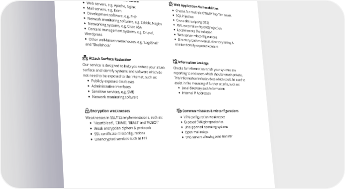 What we checked Here are some examples of what we checked your targets and their reachable webpages for. Total checks 143,306 Targets 3 Issues discovered 0 Vulnerable software & hardware Web servers, e.g. Apache, Nginx Mail servers, e.g. Exim Development software, e.g. PHP Network monitoring software, e.g. Zabbix, Nagios Networking systems, e.g. Cisco ASA Content management systems, e.g. Drupal, Wordpress Other well-known weaknesses, e.g. 'Log4Shell' and 'Shellshock' Web Application Vulnerabilities Checks for multiple OWASP Top Ten issues SQL injection Cross-site scripting (XSS) XML external entity (XXE) injection Local/remote file inclusion Web server misconfigurations Directory/path traversal, directory listing & unintentionally exposed content Attack Surface Reduction Our service is designed to help you reduce your attack surface and identify systems and software which do not need to be exposed to the Internet, such as: Publicly exposed databases Administrative interfaces Sensitive services, e.g. SMB Network monitoring software Information Leakage Checks for information which your systems are reporting to end-users which should remain private. This information includes data which could be used to assist in the mounting of further attacks, such as: Local directory path information Internal IP Addresses Encryption weaknesses Weaknesses in SSL/TLS implementations, such as: 'Heartbleed', 'CRIME', 'BEAST' and 'ROBOT' Weak encryption ciphers & protocols SSL certificate misconfigurations Unencrypted services such as FTP Common mistakes & misconfigurations VPN configuration weaknesses Exposed SVN/git repositories Unsupported operating systems Open mail relays DNS servers allowing zone transfer 2 of 4