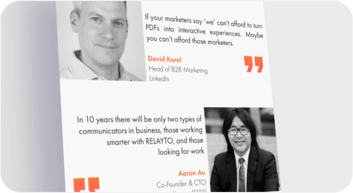 If your marketers say ‘we’ can’t afford to turn PDFs into interactive experiences. Maybe you can’t afford those marketers. David Karel Head of B2B Marketing LinkedIn In 10 years there will be only two types of communicators in business, those working smarter with RELAYTO, and those looking for work Aaron Au Co-Founder & CTO SuccessFactors (SFSF)