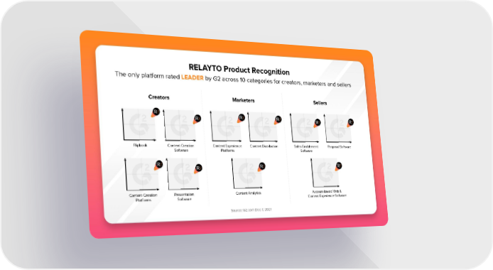 RELAYTO Product Recognition The only platform rated LEADER by G2 across 10 categories for creators, marketers and sellers Creators Marketers Sellers Flipbook Content Creation Content Experience Content Distribution Sales Enablement Proposal Software Software Platforms Software Content Creation Presentation Content Analytics Account-based Web & Platforms Software Content Experience Software Source: G2.com Dec 7, 2021
