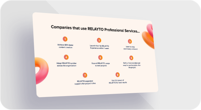 Companies that use RELAYTO Professional Services… 1 2 3 Achieve 80% faster Launch their 1st RELAYTO Learn to stay content creation Experience within 1 week seamlessly on-brand 4 5 6 Get’s a fully branded and Adopt RELAYTO quicker Expand RELAYTO usage easy to use template after across the organization to new projects the project 7 8 RELAYTO expanded Use full power of support after project is live RELAYTO for best results