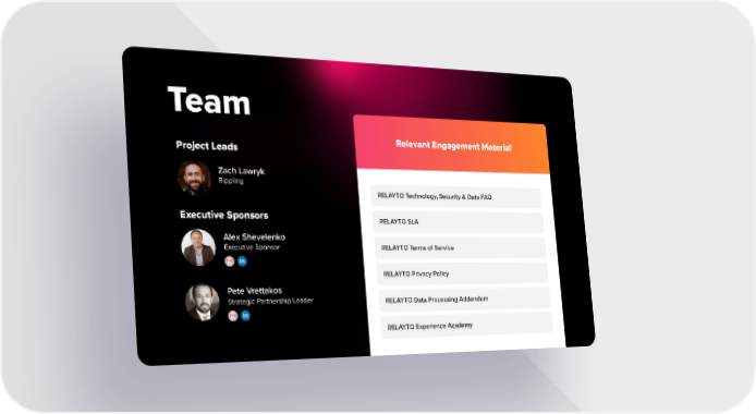 Team Relevant Engagement Material Project Leads Zach Lawryk Rippling RELAYTO Technology, Security & Data FAQ Executive Sponsors RELAYTO SLA Alex Shevelenko Executive Sponsor RELAYTO Terms of Service RELAYTO Privacy Policy Pete Vrettakos Strategic Partnership Leader RELAYTO Data Processing Addendum RELAYTO Experience Academy