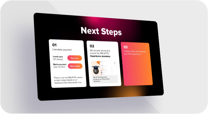 Next Steps RELAYTO AI powered platform has brought an entirely new approach to pursuits, by converting all sales content and any file type into a single immersive digital experience, which enables deal teams to connect and collaborate with customers, bring big ideas to life and differentiate Accenture from competition. 01 02 03 Complete payment Set up your account & Create, share and measure review the RELAYTO your first experience Experience Academy Credit card Pay now [3% charge] Bank payment Wire details [wire transfer] Please note that RELAYTO cannot RELAYTO/ Experience Academy and Onboarding accept mailed checks to its Resources Delaware USA office at this time.
