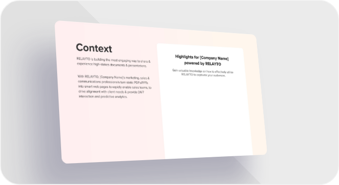 Context Highlights for [Company Name] RELAYTO is building the most engaging way to share & powered by RELAYTO experience high-stakes documents & presentations. Gain valuable knowledge on how to effectively utilize RELAYTO to captivate your audiences. With RELAYTO, [Company Name]’s marketing, sales & communications professionals turn static PDFs/PPTs into smart web pages to rapidly enable sales teams, to drive alignment with client needs & provide 24/7 interaction and predictive analytics.
