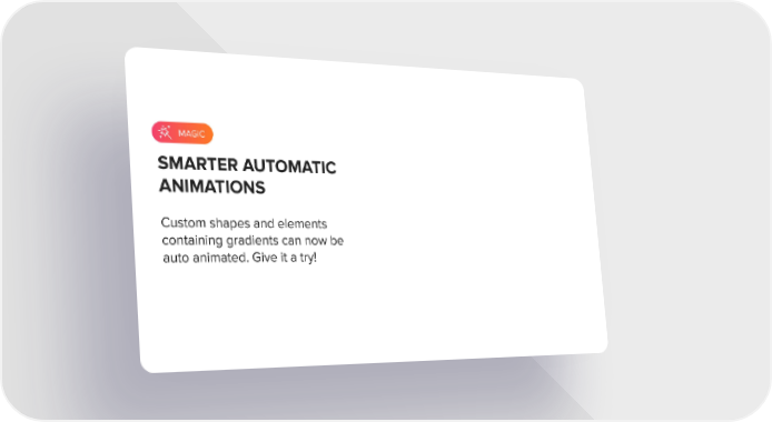 MAGIC MAGIC SMARTER AUTOMATIC ANIMATIONS Custom shapes and elements containing gradients can now be auto animated. Give it a try!
