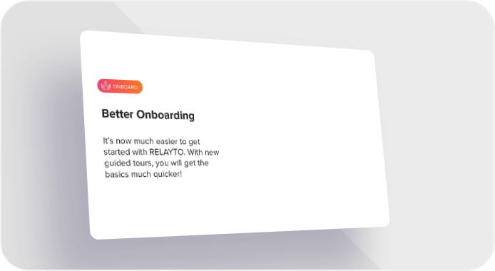 MAGIC ONBOARD Better Onboarding It’s now much easier to get started with RELAYTO. With new guided tours, you will get the basics much quicker!