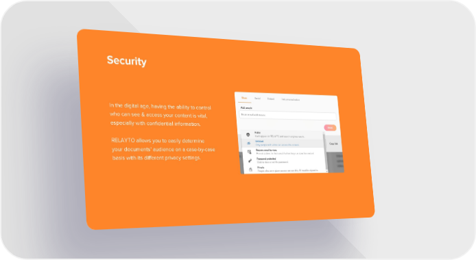 Security In the digital age, having the ability to control who can see & access your content is vital, especially with confidential information. RELAYTO allows you to easily determine your documents’ audience on a case-by-case basis with its different privacy settings.