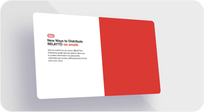 New New Ways to Distribute RELAYTO via emails Secure content as you share. RELAYTO's enterprise-grade security options allow you to protect information via passwords, restricted user access, deļ¬ned period of time and much more.