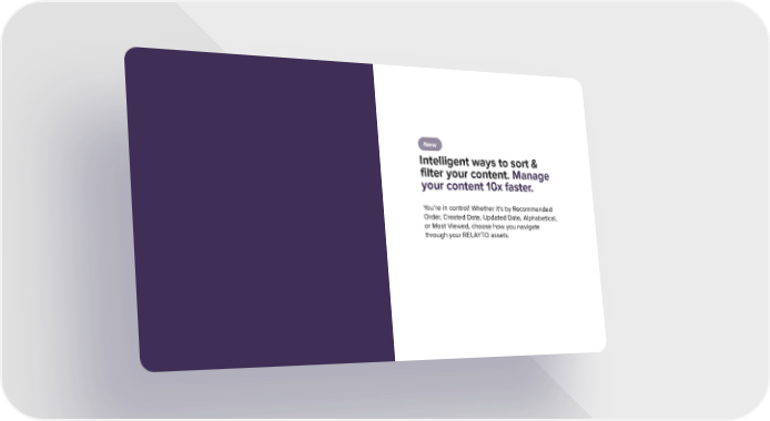 New Intelligent ways to sort & filter your content. Manage your content 10x faster. You’re in control! Whether it’s by Recommended Order, Created Date, Updated Date, Alphabetical, or Most Viewed, choose how you navigate through your RELAYTO assets.