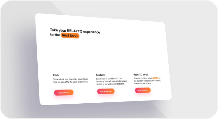 Take your RELAYTO experience to the next level. Pitch Academy RELAYTO on G2 Take a look into the other advantages Learn how to use RELAYTO by The only platform rated LEADER by that we can offer for your experience. browsing through example templates G2 across 9 categories for creators, & visiting our video walkthroughs. marketers and sellers. View Pitch > View Academy > Write Review >