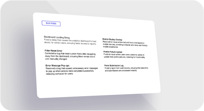 BUG FIXES Dashboard Loading Delay Mobile Display Overlap Fixed a delay that caused the analytics dashboard to load Resolved an issue where text and icons overlapped on slowly for certain users, ensuring faster access to reports. mobile devices, providing a cleaner and more user-friendly mobile experience. Filter Reset Error Profile Picture Upload Corrected a bug that reset custom filters after navigating Fixed an issue where users were unable to upload or away from the dashboard, ensuring filters remain active update their profile pictures, restoring full functionality. until manually changed. Error Message Pop-ups Form Submission Lag Resolved a bug that caused unnecessary error messages Fixed a lag in form submissions, ensuring that data entry to pop up when actions were completed successfully, and submissions are processed instantly. reducing confusion for users.