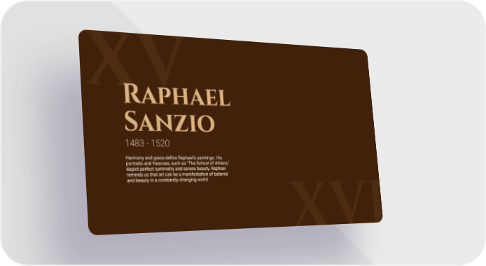 Raphael Sanzio 1483 - 1520 Harmony and grace de昀椀ne Raphael's paintings. His portraits and frescoes, such as "The School of Athens," depict perfect symmetry and serene beauty. Raphael reminds us that art can be a manifestation of balance and beauty in a constantly changing world.