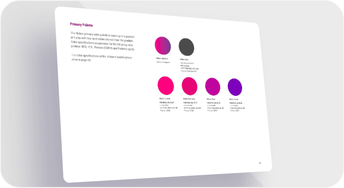 1 Primary Palette The Ribbon primary color palette is made up of a gradient a nd gr ey with four spot colors deriv ed from the gradient. Color specifications are provided for the following color profiles: RGB, HEX, Process (CMYK) and Pantone (spot). F or color specifications of the Ribbon Gradient please refer to page 2 3 . Ribbon Gradient Reference Page 2 3 Ribbon Fuchsia RGB R255, G0, B127 HEX FF007F CMYK C0, M100, Y22, K0 Pantone 205C Ribbon Grey RGB R75, G75, B75 HEX 4b4b4b CMYK C66, M58, Y57, K38 Pantone Cool Grey 11C Ribbon Cranberry RGB R233, G5, B117 HEX E90575 CMYK C0, M100, Y22, K0 Pantone 213C Ribbon Plum RGB R192, G5, B158 HEX C0059E CMYK C28, M100, Y0, K0 Pantone 247 C Ribbon Purple RGB R126, G0, B185 HEX 7E00B9 CMYK C66, M93, Y0, K0 Pantone 267C