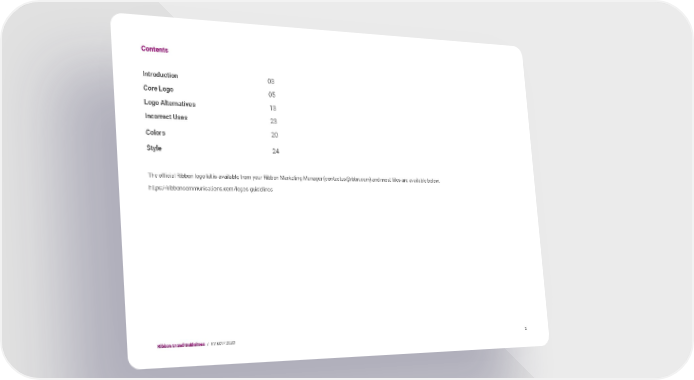 2 Ribbon Brand Guidelines / V 3 MAY 2020 03 05 13 23 Contents In troduction Core Logo Logo Alternatives Incorre ct Uses Color s 2 0 The official Ribbon logo kit is available from your Ribbon Marketing Manager (contactus@rbbn.com) and most files are available below. https://ribboncommunications.com/logos-guidelines Style 2 4
