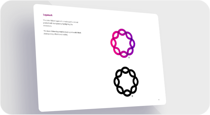 17 Logomark The color Ribbon logomark is made up of a colored gradient with transparency highlighting the crossovers. The black Ribbon logomark is made up of a solid black (transparency effect is not visible).