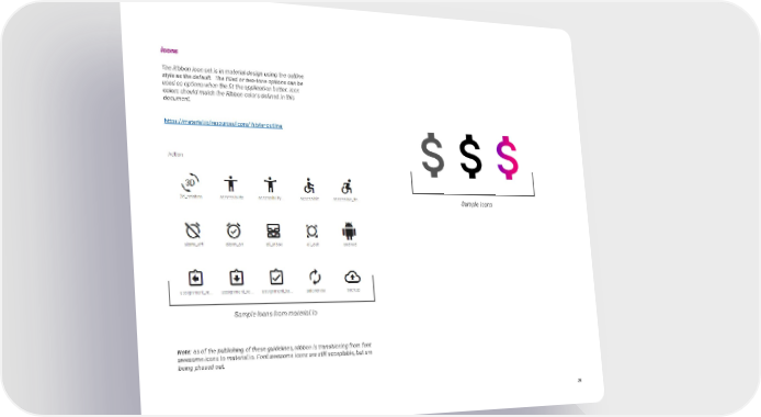 Icons The Ribbon icon set is in material design using the outline style as the default. The filled or two-tone options can be used as options when the fit the application better. Icon colors should match the Ribbon colors defined in this document. https://material.io/resources/icons/?style=outline Sample Icons from material.io Sample Icons Note : as of the publishing of these guide lines, Ribbon is transitioning from font awesome icons to material.io. Font awesome icons are still acceptable, but are being phased out. 25