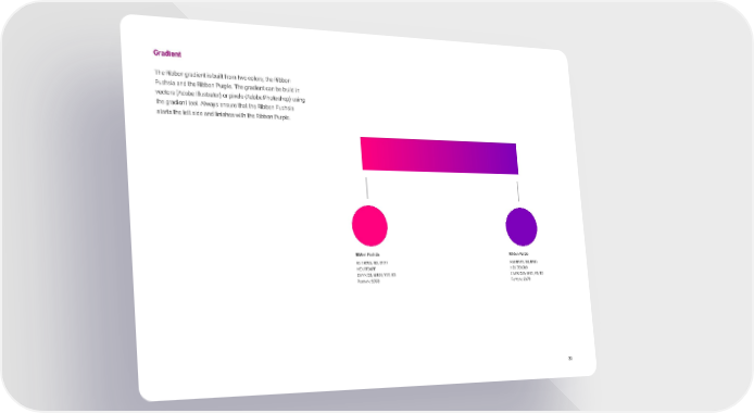 2 3 Gradient The Ribbon gradient is built from two colors; the Ribbon Fuchsia and the Ribbon Purple. The gradient can be build in vectors (Adobe Illustrator) or pixels (Adobe Photoshop) using the gradient tool. Always ensure that the Ribbon Fuchsia starts the left side and finishes with the Ribbon Purple. Ribbon Fuchsia RGB R255, G0, B127 HEX FF007F CMYK C0, M100, Y22, K0 Pantone 205C Ribbon Purple RGB R126, G0, B185 HEX 7E00B9 CMYK C66, M93, Y0, K0 Pantone 267C